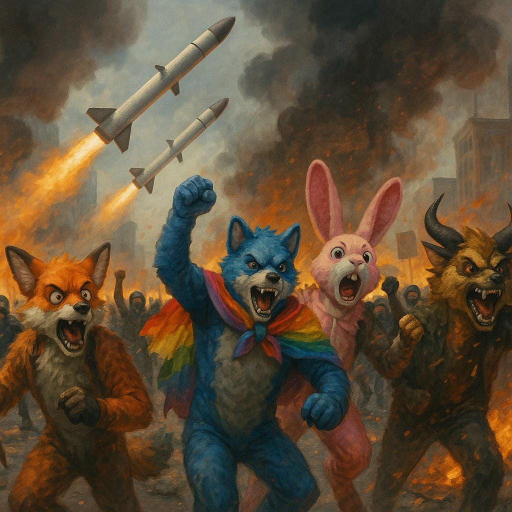 In the United States — in Chicago, Illinois, and other states — a full-scale civil war is underway between the leftist Marxist-transgender-furry-pervert forces on one side and the Immigration and Customs Enforcement agency (ICE) on the other. The Marxist-transgender people are currently winning, attacking immigration officers with lasers and pelting them with trash, but soon weapons will enter the fray. In America, anyone can buy them — even the furries.