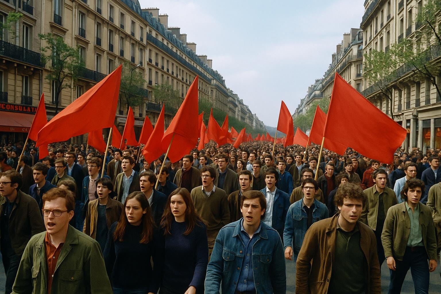 On the other side of the barricades, we can quote the writer Morgan Sportès, then a Maoist activist, who also sheds light on the background of this genuine anti-Gaullist color revolution that May ’68 represented: “What the sympathetic and, to some extent, naïve Cohn-Bendit does not boast about is that since March 1968 he was followed step by step by Paris Match and RTL, among others, who transformed him into a ‘revolutionary star.’ Photo reports on Cohn-Bendit in his kitchen, making coffee; or playing with his brother’s children; or, the height of irony, a double-page spread showing him in a jacket, carrying a ‘wandering Bolshevik’s suitcase’ in front of the Brandenburg Gate, with the caption: ‘And now he goes to preach anarchy throughout Europe.’ This, mind you, in Match, a ‘leftist rag’ if ever there was one!!! It was in Match’s car, a Citroën ID 19, that Cohn-Bendit left France in mid-May 1968, and it was in Match’s car that he re-entered it—his red hair dyed black. A real commedia dell’arte!”
