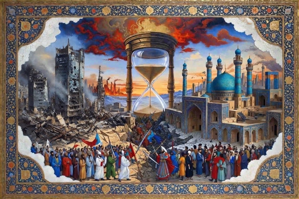 In the Middle East, it first takes the shape of primordial pagan forms that existed before the rise of Islam, today, in the 21st century AD, we are traversing our modern Babylon, as Abraham did during the 21st century BC. The Arab world sinks into a disoriented state as neo-pagan forms re-emerge in a modern guise, almost unknowingly. This is, not a Neo-Jahiliya, it is the Final-Jahiliya, prior to the miraculous return of our organic spiritual forms. Just as how Arabs once required suffering in order to give birth to their culture’s final spiritual form—Islam. The Arabs will be forced into a collective traumatic experience, one of eschatological dimensions, in order to successfully revive their real spiritual form, which is a pre-requisite to civilizational revival. History seems to be returning into itself slowly. It constantly rhymes, but with each repetition its cry is louder, as if attempting to warn us that this could be its final cry—the swan song of history culminating in Armageddon. It is not a surprise that geopolitics and eschatology are converging; it is fulfilment of prophecy after all, if we are to take metaphysics seriously. The West has adopted eschatology implicitly with Evangelical and Catholic notions guiding its foreign policy across the past centuries and is today openly and explicitly using eschatological language in its political rhetoric. It is then not surprising to see the Shia resistance explicitly affirming its eschatological ideas and expressing a clear sense of eschatological urgency, one that seems to be still missing within the Sunni realms, as Aleksander Dugin has emphasized recently. Israel is also not hiding its eschatological aspirations as it aligns fully with its current approach to foreign policy. As history reaches the inflection point (point “0”), the Islamic world needs to adopt an eschatologically affirming form, one where a sense of eschatological urgency directs all dimensions of higher cultural life. But this in itself, according to eschatological traditions, is bound to happen as we slowly realize the power of our real spiritual forms. When the eschatological dimension of current developments reaches a crescendo, it will inevitably lead to a revival at the civilizational level. As I always say, eschatology is history occurring backwards. It is, essentially, history in reverse order.
