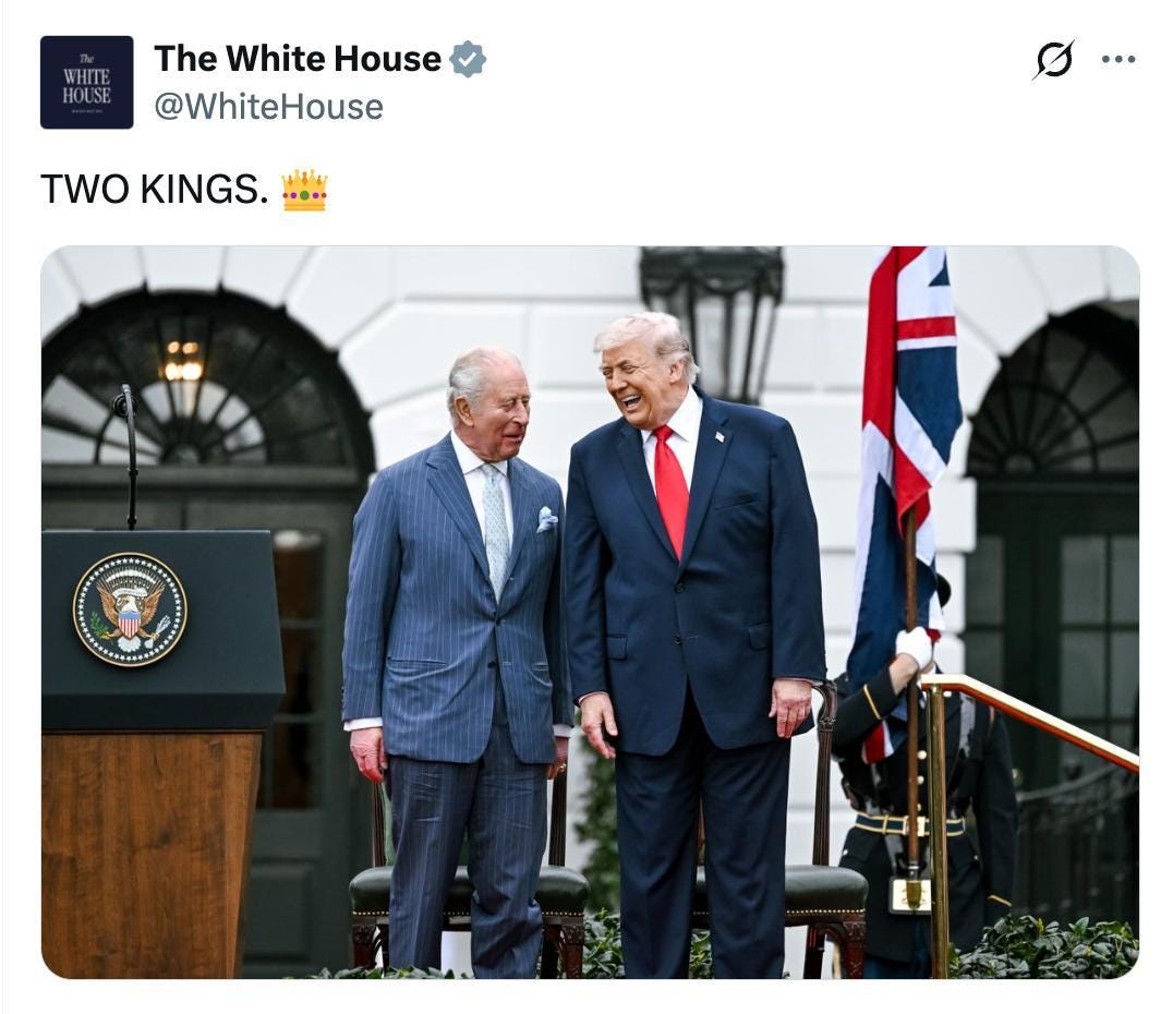 He did not forget ecology either, which had previously irritated Trump. Today, Trump supporters (in particular, Mark Levin) are praising King Charles, and a photograph of Charles and Trump has appeared on the White House website with the caption “Two Kings,” alluding to the slogan of anti-Trump campaigns organized by Democrats: “No Kings!” If you do not want one king—an American one—you will get two.